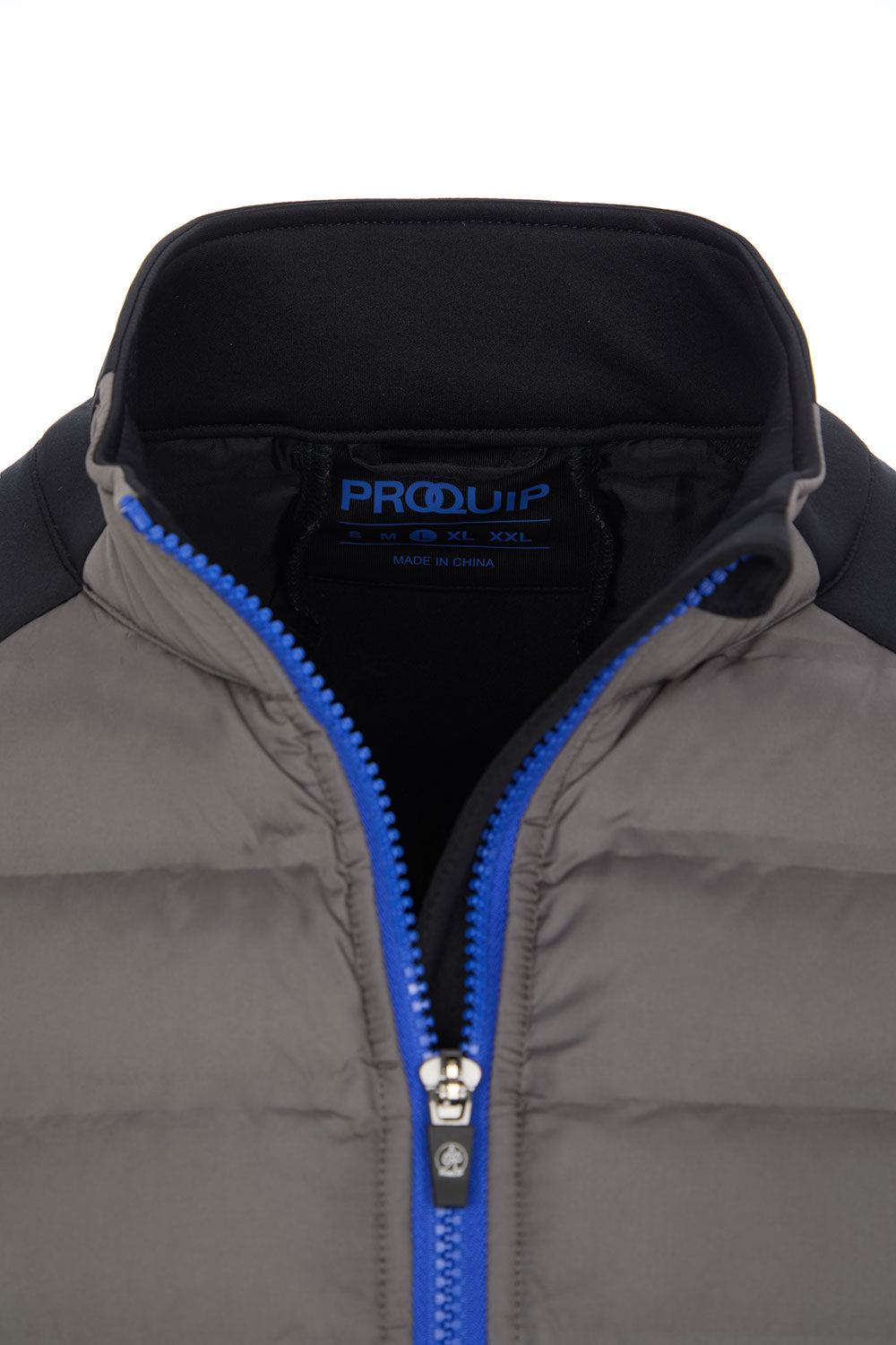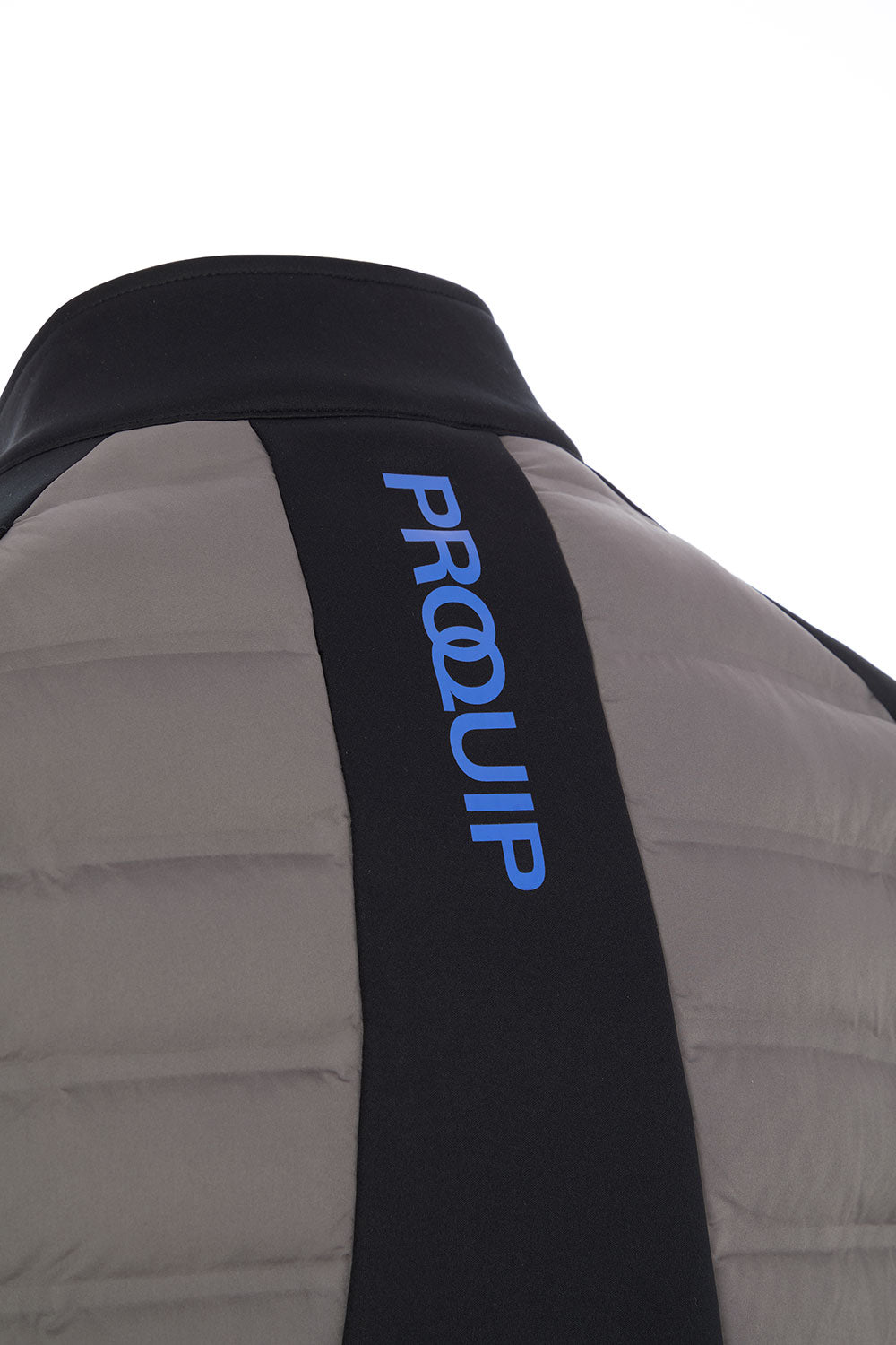 A thermal quilted windproof with polyester down-fill and an eye-catching embossed rhomboid design. Made from polyester soft shell, lightly down filled and treated with DWR (durable water repellent) for protection against wind and rain.
